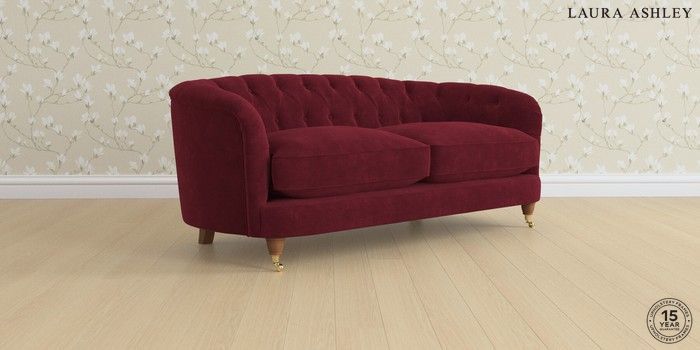 7.0.3 Buy Hathersage by Laura Ashley 3 Seater Small Sofa Alwyn Velvet Burgundy Red Low Brass Castor - Teak from the Laura Ashley online shop Click here to use our website with more accessibility support, for example screen readers