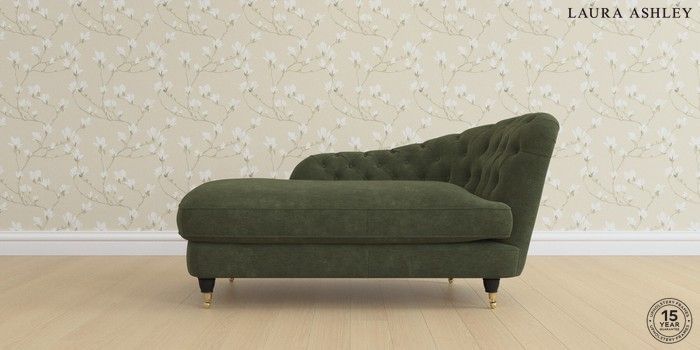 7.0.3 Buy Hathersage by Laura Ashley Chaise Longue Right Hand Alwyn Velvet Ivy Green Low Brass Castor - Black from the Laura Ashley online shop Click here to use our website with more accessibility support, for example screen readers