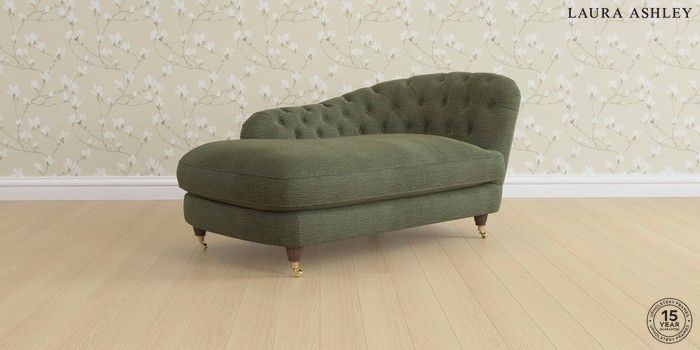 7.0.3 Buy Hathersage by Laura Ashley Chaise Longue Right Hand Edwin Chenille Hedgerow Green Low Brass Castor - Chestnut from the Laura Ashley online shop Click here to use our website with more accessibility support, for example screen readers