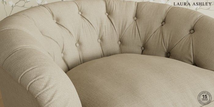 The Laura Ashley Hathersage is a signature deep sit curved sofa in the Chesterfield style. Featuring deep buttoned arms matching the height of the back of the sofa, combined with deep seat cushions filled with foam core and fibre wrap interiors, this sofa is perfect for relaxing in. A gently curved front seat profile and turned legs with brass or chrome castors complete this design.