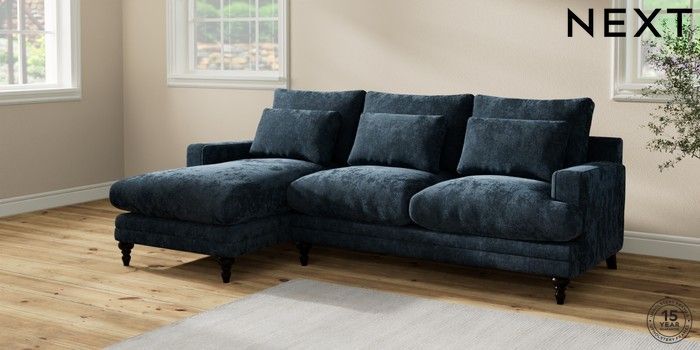 6.12.1 Buy Hutton Deep Relaxed Sit Medium Sofa Chaise - Left Hand Distressed Velour Midnight Blue Country Turned - Dark from the Laura Ashley online shop Click here to use our website with more accessibility support, for example screen readers