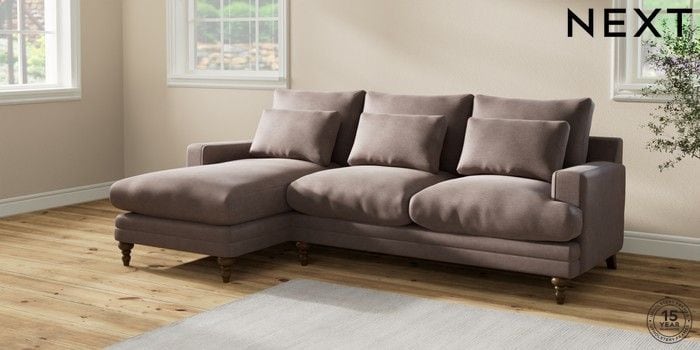 6.12.1 Buy Hutton Deep Relaxed Sit Medium Sofa Chaise - Left Hand Luxe Chenille Mink Brown Country Turned - Mid from the Laura Ashley online shop Click here to use our website with more accessibility support, for example screen readers