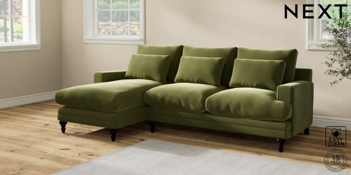 6.12.1 Buy Hutton Deep Relaxed Sit Medium Sofa Chaise - Left Hand Plush Velvet Easy Clean Mid Olive Green Country Turned - Dark from the Laura Ashley online shop Click here to use our website with more accessibility support, for example screen readers