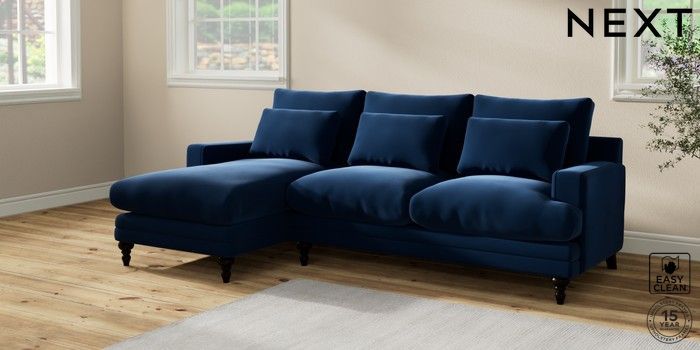 6.12.1 Buy Hutton Deep Relaxed Sit Medium Sofa Chaise - Left Hand Plush Velvet Easy Clean Navy Blue Country Turned - Dark from the Laura Ashley online shop Click here to use our website with more accessibility support, for example screen readers