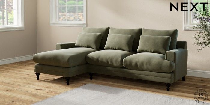 6.12.1 Buy Hutton Deep Relaxed Sit Medium Sofa Chaise - Left Hand Ripple Chenille Mid Moss Green Country Turned - Dark from the Laura Ashley online shop Click here to use our website with more accessibility support, for example screen readers