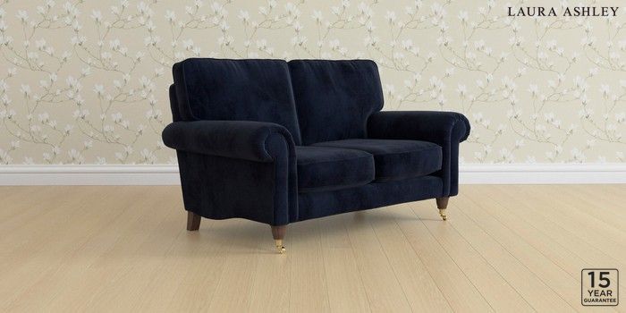 6.12.1 Buy Kingston by Laura Ashley 2 Seater Small Sofa Orla Midnight Navy Low Brass Castor - Chestnut from the Laura Ashley online shop Click here to use our website with more accessibility support, for example screen readers