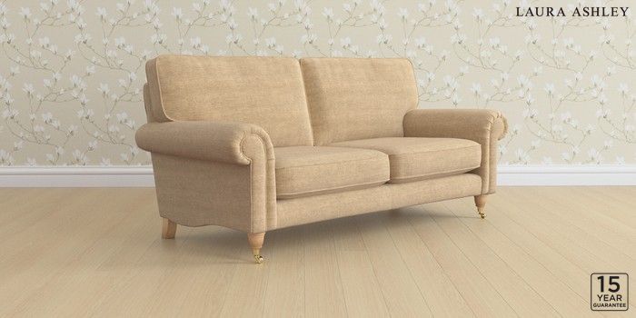 6.12.1 Buy Kingston by Laura Ashley 3 Seater Small Sofa Edwin Chenille Gold Natural Low Brass Castor - Light Oak from the Laura Ashley online shop Click here to use our website with more accessibility support, for example screen readers