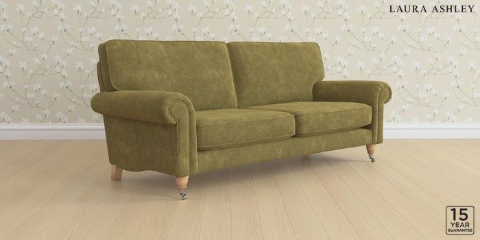 6.12.1 Buy Kingston by Laura Ashley 3 Seater Sofa Alwyn Velvet Olive Green Low Chrome Castor - Light Oak from the Laura Ashley online shop Click here to use our website with more accessibility support, for example screen readers