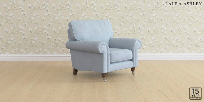 6.12.1 Buy Kingston by Laura Ashley Armchair Ailsworth Newport Blue Low Chrome Castor - Chestnut from the Laura Ashley online shop Click here to use our website with more accessibility support, for example screen readers
