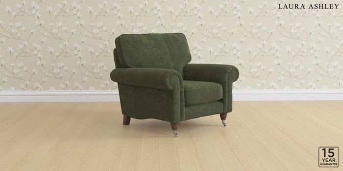 6.12.1 Buy Kingston by Laura Ashley Armchair Alwyn Velvet Ivy Green Low Chrome Castor - Chestnut from the Laura Ashley online shop Click here to use our website with more accessibility support, for example screen readers