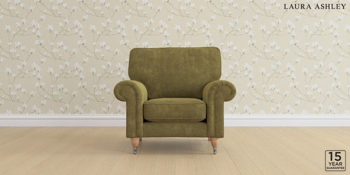 6.12.1 Buy Kingston by Laura Ashley Armchair Alwyn Velvet Olive Green Low Chrome Castor - Light Oak from the Laura Ashley online shop Click here to use our website with more accessibility support, for example screen readers