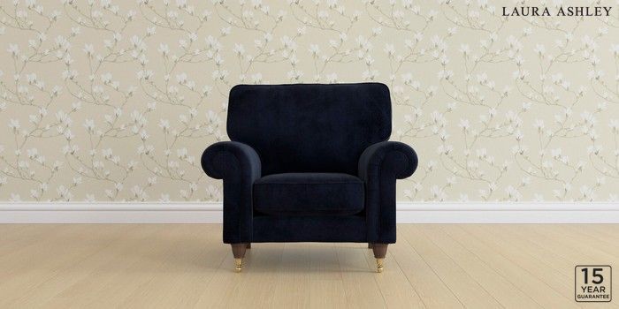 6.12.1 Buy Kingston by Laura Ashley Armchair Orla Midnight Navy Low Brass Castor - Chestnut from the Laura Ashley online shop Click here to use our website with more accessibility support, for example screen readers