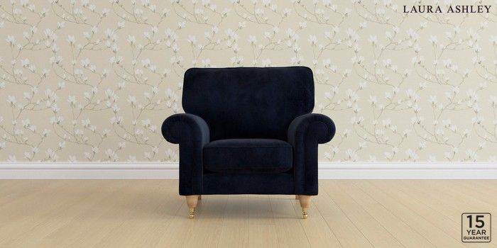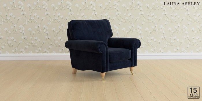 6.12.13 Buy Kingston by Laura Ashley Armchair Orla Midnight Navy Low Brass Castor - Light Oak from the Laura Ashley online shop Click here to use our website with more accessibility support, for example screen readers