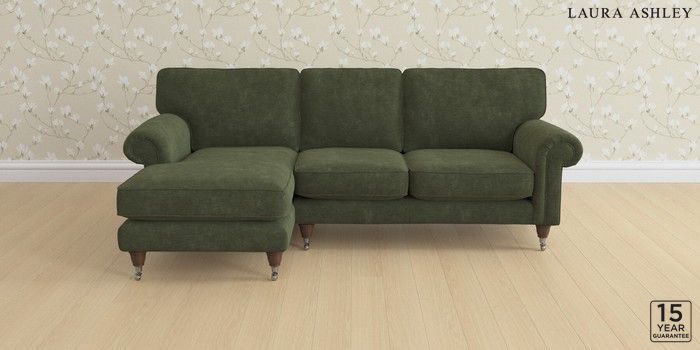 6.12.1 Buy Kingston by Laura Ashley Medium Sofa Chaise - Left Hand Alwyn Velvet Ivy Green Low Chrome Castor - Chestnut from the Laura Ashley online shop Click here to use our website with more accessibility support, for example screen readers