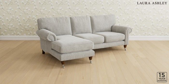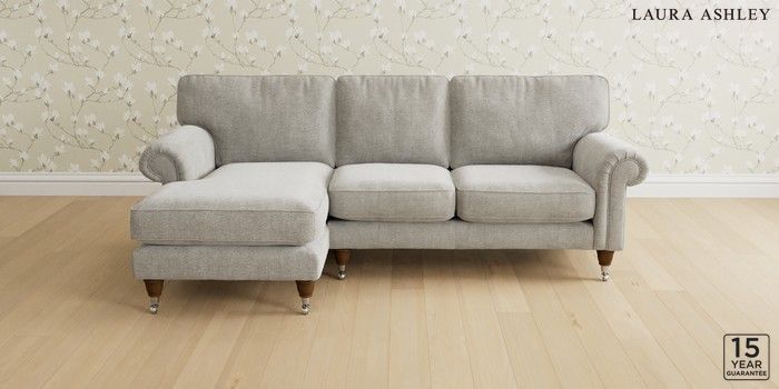 6.12.1 Buy Kingston by Laura Ashley Medium Sofa Chaise - Left Hand Edwin Chenille Silver Grey Low Brass Castor - Teak from the Laura Ashley online shop Click here to use our website with more accessibility support, for example screen readers