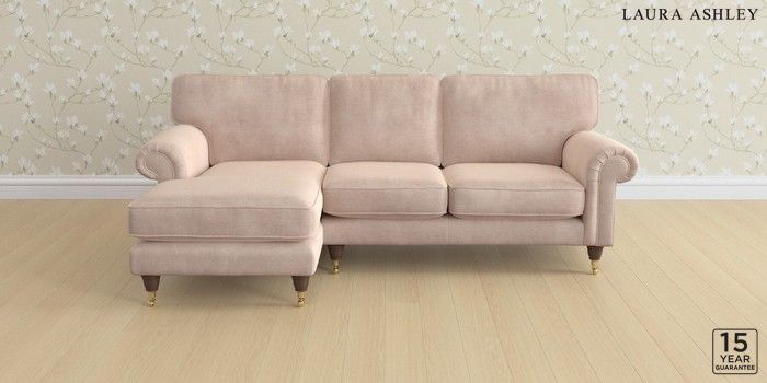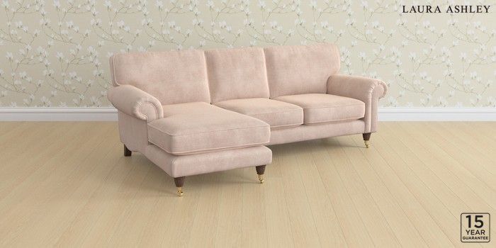 6.12.1 Buy Kingston by Laura Ashley Medium Sofa Chaise - Left Hand Orla Chalk Pink Low Brass Castor - Chestnut from the Laura Ashley online shop Click here to use our website with more accessibility support, for example screen readers