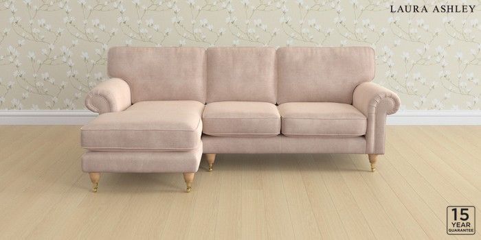 6.12.1 Buy Kingston by Laura Ashley Medium Sofa Chaise - Left Hand Orla Chalk Pink Low Brass Castor - Light Oak from the Laura Ashley online shop Click here to use our website with more accessibility support, for example screen readers