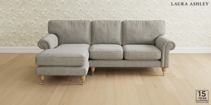 6.12.1 Buy Kingston by Laura Ashley Medium Sofa Chaise - Left Hand Orla Pale Steel Grey Low Brass Castor - Light Oak from the Laura Ashley online shop Click here to use our website with more accessibility support, for example screen readers