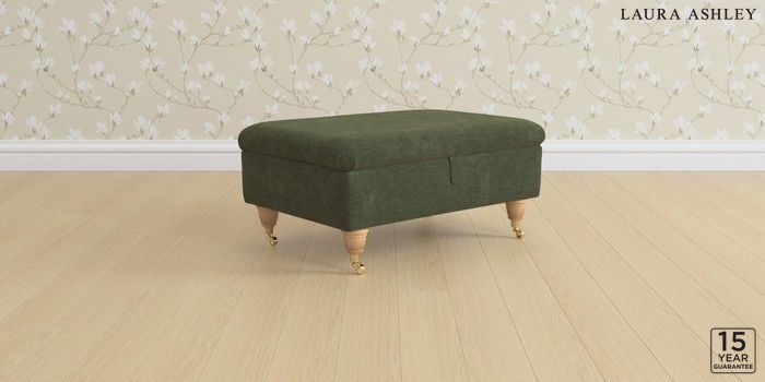 6.12.1 Buy Kingston by Laura Ashley Storage Footstool Alwyn Velvet Ivy Green Low Brass Castor - Light Oak from the Laura Ashley online shop Click here to use our website with more accessibility support, for example screen readers