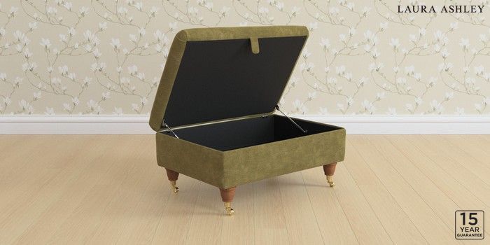 7.2.10 Buy Kingston by Laura Ashley Storage Footstool Alwyn Velvet Olive Green Low Brass Castor - Teak from the Laura Ashley online shop Click here to use our website with more accessibility support, for example screen readers
