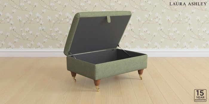 7.2.10 Buy Kingston by Laura Ashley Storage Footstool Harley Moss Green Low Brass Castor - Teak from the Laura Ashley online shop Click here to use our website with more accessibility support, for example screen readers
