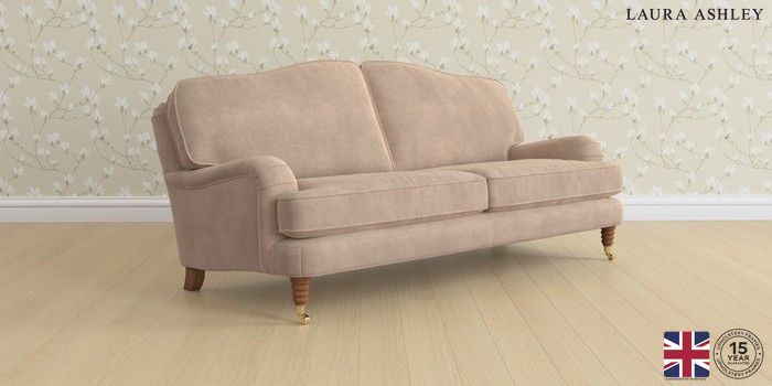 6.12.1 Buy Lynden by Laura Ashley 3 Seater Sofa Ailsworth Mink Natural Ornate Brass Castor - Teak from the Laura Ashley online shop Click here to use our website with more accessibility support, for example screen readers