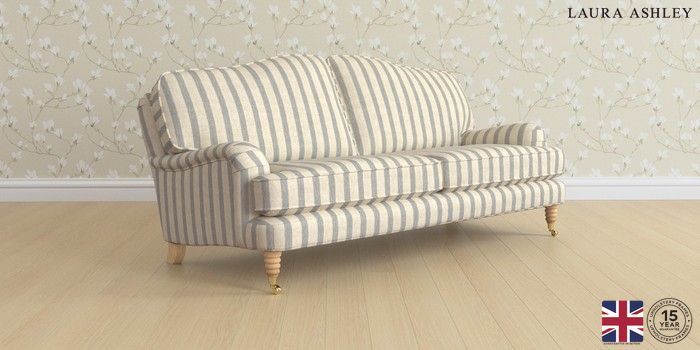 6.12.1 Buy Lynden by Laura Ashley 3 Seater Sofa Kinsham Stripe Seaspray Blue Ornate Brass Castor - Light Oak from the Laura Ashley online shop Click here to use our website with more accessibility support, for example screen readers