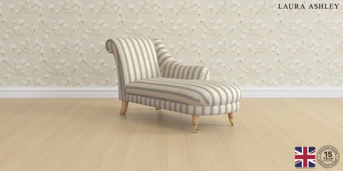 6.12.1 Buy Lynden by Laura Ashley Chaise Longue Right Hand Kinsham Stripe Seaspray Blue Ornate Brass Castor - Light Oak from the Laura Ashley online shop Click here to use our website with more accessibility support, for example screen readers