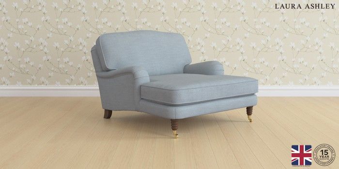 6.12.1 Buy Lynden by Laura Ashley Snuggle Chaise Kinsham Seaspray Blue Ornate Brass Castor - Chestnut from the Laura Ashley online shop Click here to use our website with more accessibility support, for example screen readers