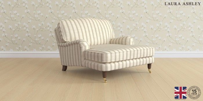 6.12.1 Buy Lynden by Laura Ashley Snuggle Chaise Kinsham Stripe Natural Ornate Brass Castor - Chestnut from the Laura Ashley online shop Click here to use our website with more accessibility support, for example screen readers
