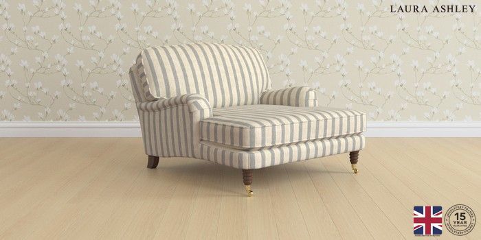 6.12.1 Buy Lynden by Laura Ashley Snuggle Chaise Kinsham Stripe Seaspray Blue Ornate Brass Castor - Chestnut from the Laura Ashley online shop Click here to use our website with more accessibility support, for example screen readers