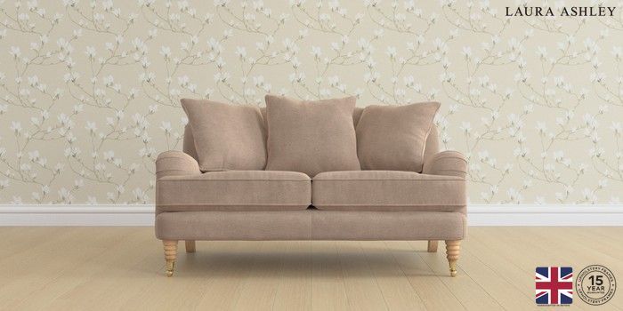 6.12.1 Buy Lynden Scatter Back by Laura Ashley 2 Seater Small Sofa Ailsworth Mink Natural Ornate Brass Castor - Light Oak from the Laura Ashley online shop Click here to use our website with more accessibility support, for example screen readers