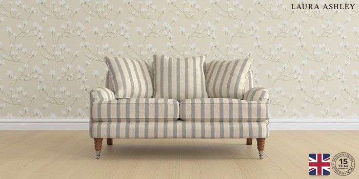 6.12.1 Buy Lynden Scatter Back by Laura Ashley 2 Seater Small Sofa Kinsham Stripe Seaspray Blue Ornate Chrome Castor - Teak from the Laura Ashley online shop Click here to use our website with more accessibility support, for example screen readers