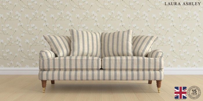 6.12.1 Buy Lynden Scatter Back by Laura Ashley 3 Seater Small Sofa Kinsham Stripe Seaspray Blue Ornate Brass Castor - Teak from the Laura Ashley online shop Click here to use our website with more accessibility support, for example screen readers