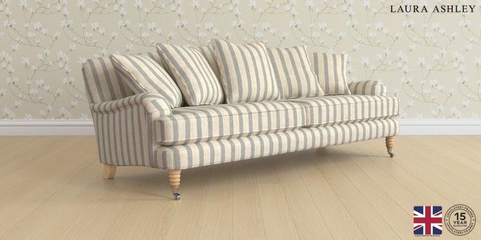 6.12.1 Buy Lynden Scatter Back by Laura Ashley 4 Seater Sofa Kinsham Stripe Seaspray Blue Ornate Chrome Castor - Light Oak from the Laura Ashley online shop Click here to use our website with more accessibility support, for example screen readers
