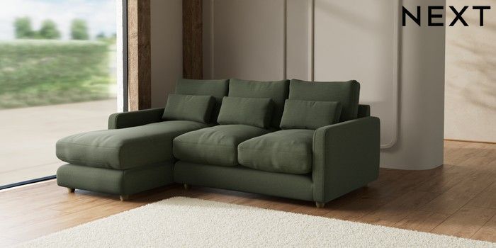7.2.6 Buy N Premium Farndon Grand Relaxed Sit Medium Sofa Chaise - Left Hand Relaxed Linen Look Dark Green Wooden Glide - Light from the Laura Ashley online shop Click here to use our website with more accessibility support, for example screen readers