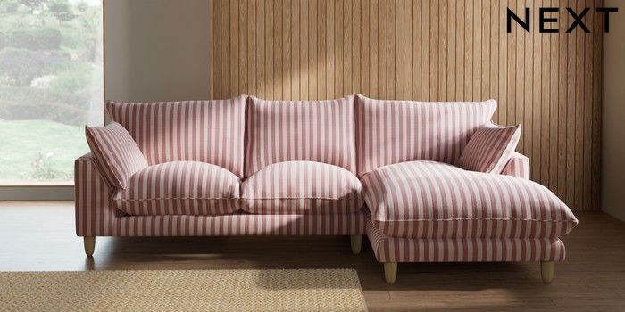 7.3.1 Buy Noa Deep Relaxed Sit Medium Sofa Chaise - Right Hand Bold Chenille Stripe Dark Pink High Leg - Light from the Laura Ashley online shop