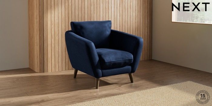 6.12.1 Buy Orlo Relaxed Sit Armchair Luxe Chenille Navy Blue Retro Tapered - Mid from the Laura Ashley online shop Click here to use our website with more accessibility support, for example screen readers