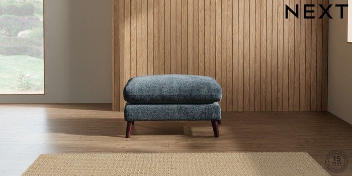 6.12.1 Buy Orlo Relaxed Sit Footstool Chunky Chenille Dark Navy Blue Retro Tapered - Dark Brown from the Laura Ashley online shop Click here to use our website with more accessibility support, for example screen readers