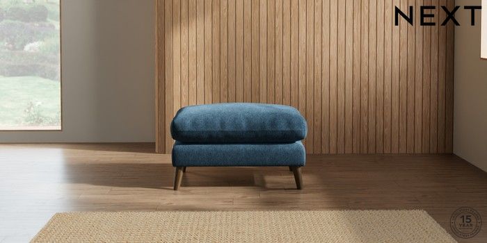 6.12.1 Buy Orlo Relaxed Sit Footstool Cotswold Chenille Dark Blue Retro Tapered - Mid from the Laura Ashley online shop Click here to use our website with more accessibility support, for example screen readers