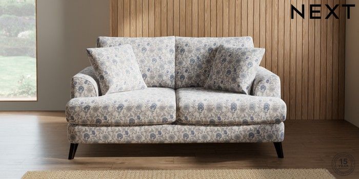 7.3.1 Buy Parker 3 Seater Small Sofa Relaxed Linen Look Print Woodblock Floral Blue Low Retro Tapered - Dark from the Laura Ashley online shop