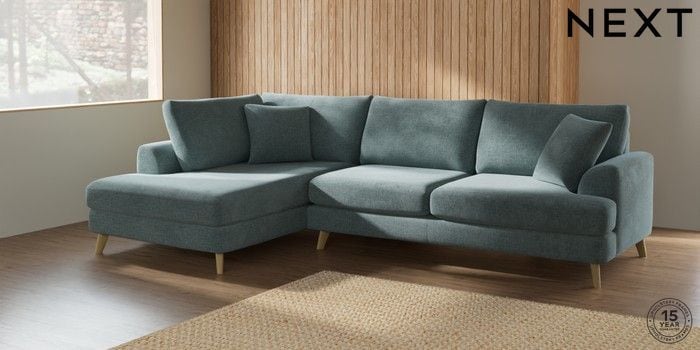 7.2.5 Buy Parker Large Corner Chaise - Left Hand Chunky Chenille Light Teal Green Low Retro Tapered - Light from the Laura Ashley online shop Click here to use our website with more accessibility support, for example screen readers