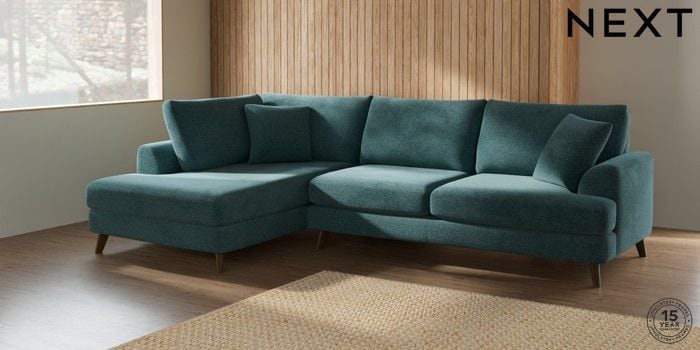 7.2.5 Buy Parker Large Corner Chaise - Left Hand Chunky Chenille Mid Teal Green Low Retro Tapered - Mid from the Laura Ashley online shop Click here to use our website with more accessibility support, for example screen readers