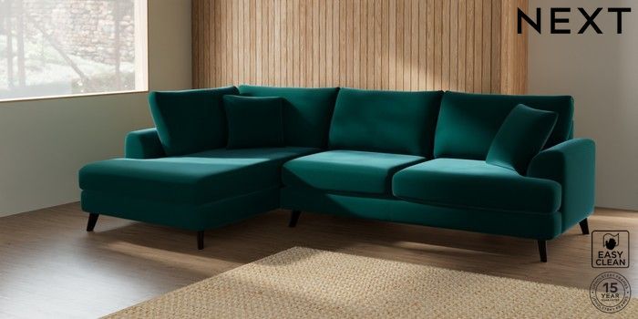 7.2.5 Buy Parker Large Corner Chaise - Left Hand Plush Velvet Easy Clean Juniper Green Low Retro Tapered - Dark from the Laura Ashley online shop Click here to use our website with more accessibility support, for example screen readers