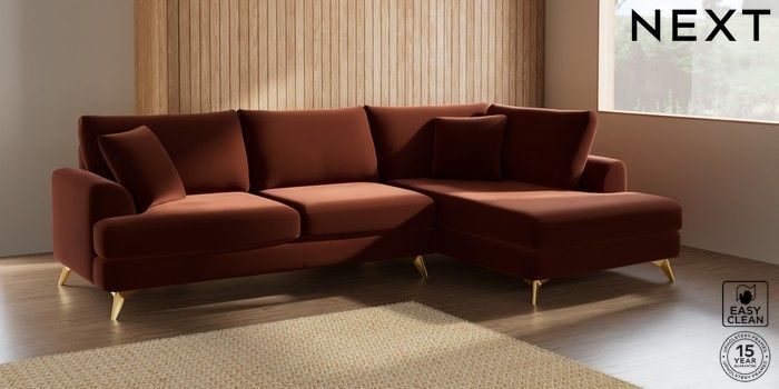 7.2.5 Buy Parker Large Corner Chaise - Right Hand Plush Velvet Easy Clean Ginger Orange High Metal - Brass from the Laura Ashley online shop Click here to use our website with more accessibility support, for example screen readers