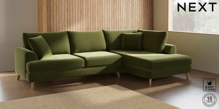 7.2.5 Buy Parker Large Corner Chaise - Right Hand Plush Velvet Easy Clean Mid Olive Green Low Retro Tapered - Light from the Laura Ashley online shop Click here to use our website with more accessibility support, for example screen readers