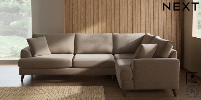 7.2.10 Buy Parker Large Corner Sofa - Right Hand Tweedy Blend Easy Clean Light Dove Natural Low Retro Tapered - Mid from the Laura Ashley online shop Click here to use our website with more accessibility support, for example screen readers