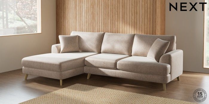 7.2.5 Buy Parker Large Sofa Chaise - Left Hand Cotswold Chenille Light Natural Low Retro Tapered - Light from the Laura Ashley online shop Click here to use our website with more accessibility support, for example screen readers