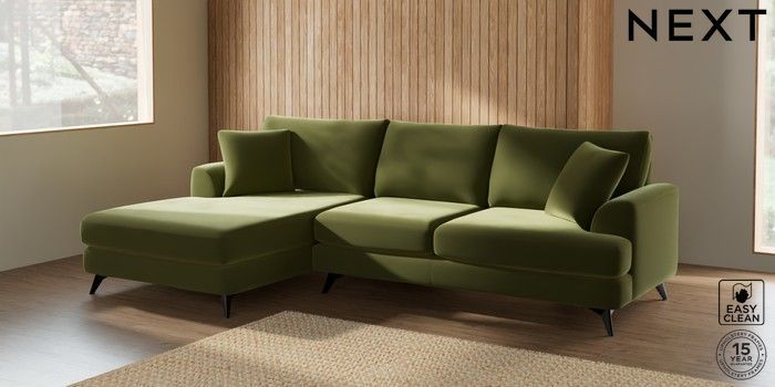 7.2.5 Buy Parker Large Sofa Chaise - Left Hand Plush Velvet Easy Clean Mid Olive Green High Metal - Black from the Laura Ashley online shop Click here to use our website with more accessibility support, for example screen readers