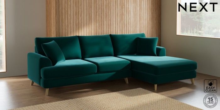 7.2.5 Buy Parker Large Sofa Chaise - Right Hand Plush Velvet Easy Clean Juniper Green Low Retro Tapered - Light from the Laura Ashley online shop Click here to use our website with more accessibility support, for example screen readers